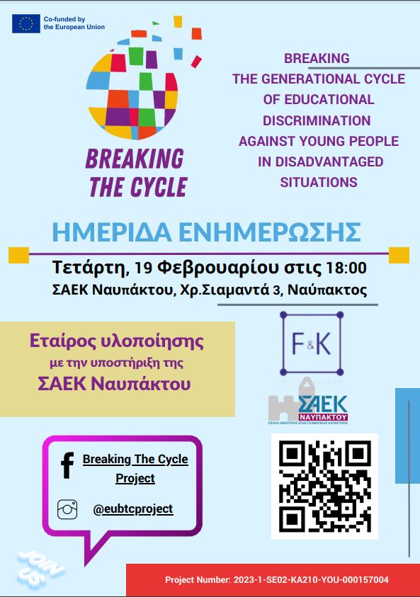 Σας προσκαλούμε στην ημερίδα ενημέρωσης με θέμα “Breaking the generational cycle of educational discrimination against young people in disadvantaged situations”που θα πραγματοποιηθεί την Τετάρτη , 19 Φεβρουαρίου 2025, στις 18:00 στη ΣΑΕΚ Ναυπάκτου.