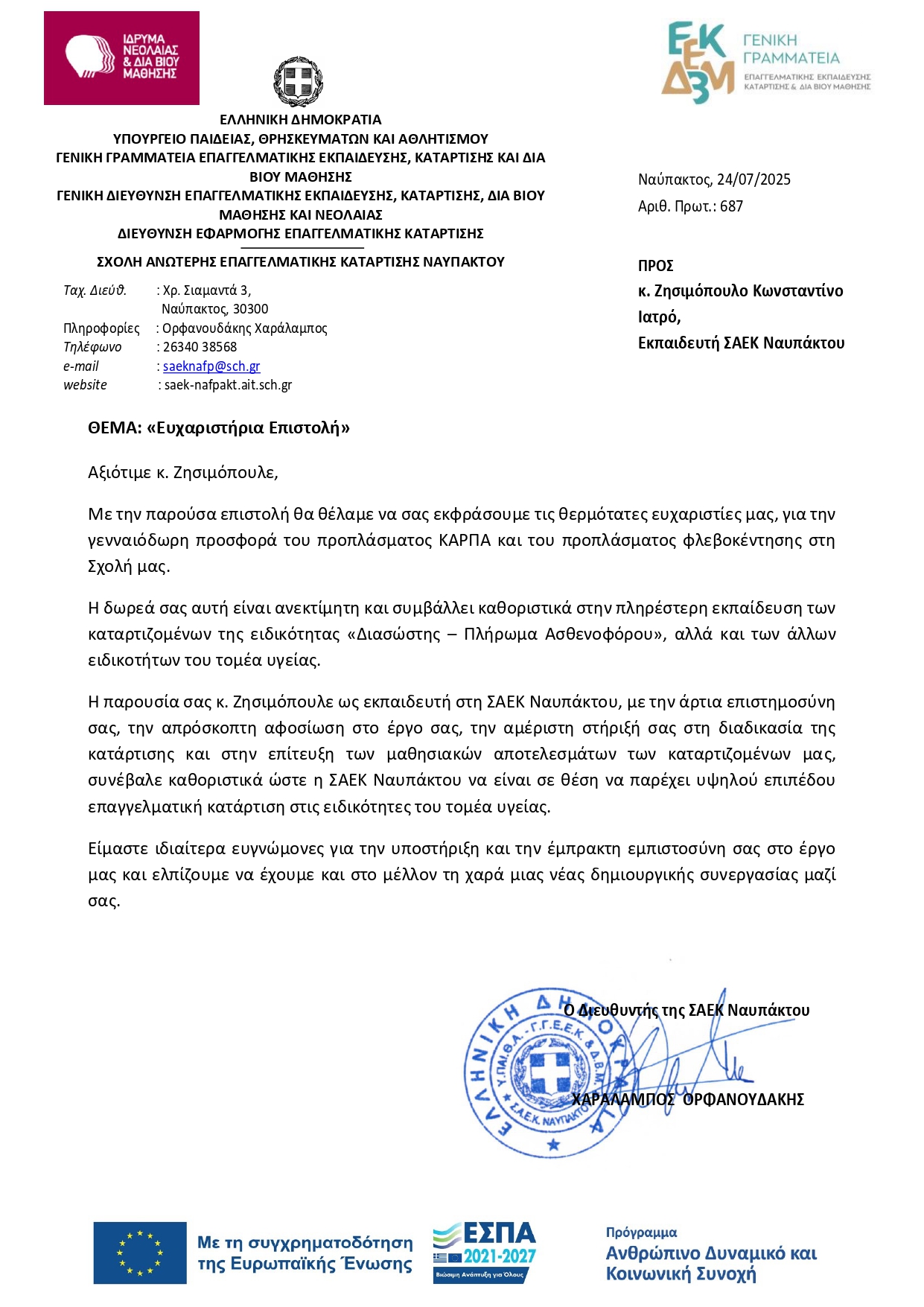 Η Διεύθυνση της ΣΑΕΚ Ναυπάκτου έχει την ιδιαίτερη χαρά να ανακοινώσει ότι εγκρίθηκε από το Ίδρυμα Κρατικών Υποτροφιών (ΙΚΥ), η πρόταση της Σχολής μας για την υλοποίηση σχεδίου κινητικότητας Erasmus+ για το έτος κατάρτισης 2025-2026. Το πρόγραμμα έχει τίτλο: «Απόκτηση …