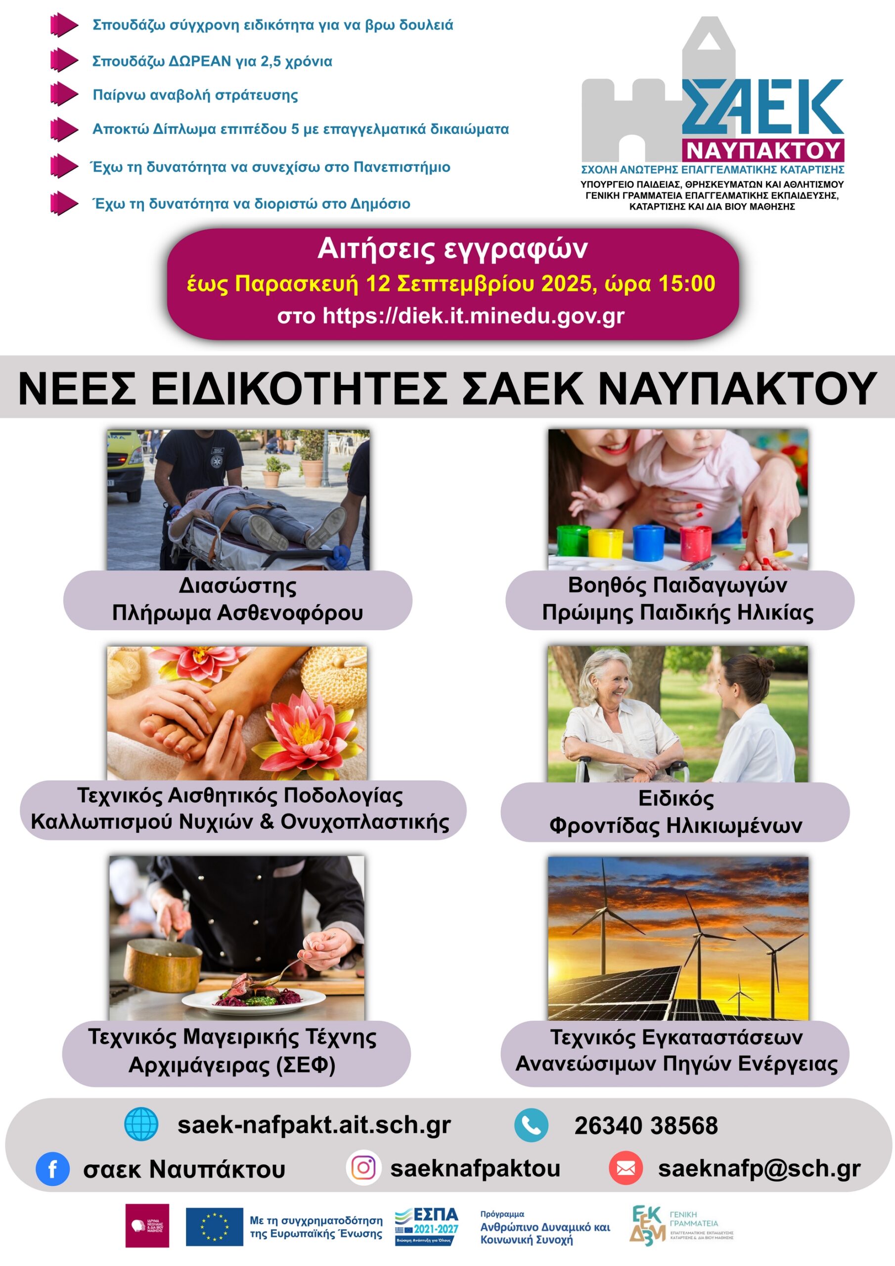 H Γενική Γραμματεία Επαγγελματικής Εκπαίδευσης, Κατάρτισης και Διά Βίου Μάθησης, ανακοινώνει την έναρξη υποβολής αιτήσεων επιλογής-εγγραφής καταρτιζόμενων στις Σχολές Ανώτερης Επαγγελματικής Κατάρτισης αρμοδιότητας του Υπουργείου Παιδείας, Θρησκευμάτων και Αθλητισμού για το εκπαιδευτικό έτος 2025-2026: από την Τρίτη 2 Σεπτεμβρίου 2025, …